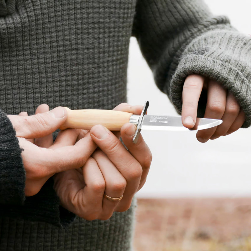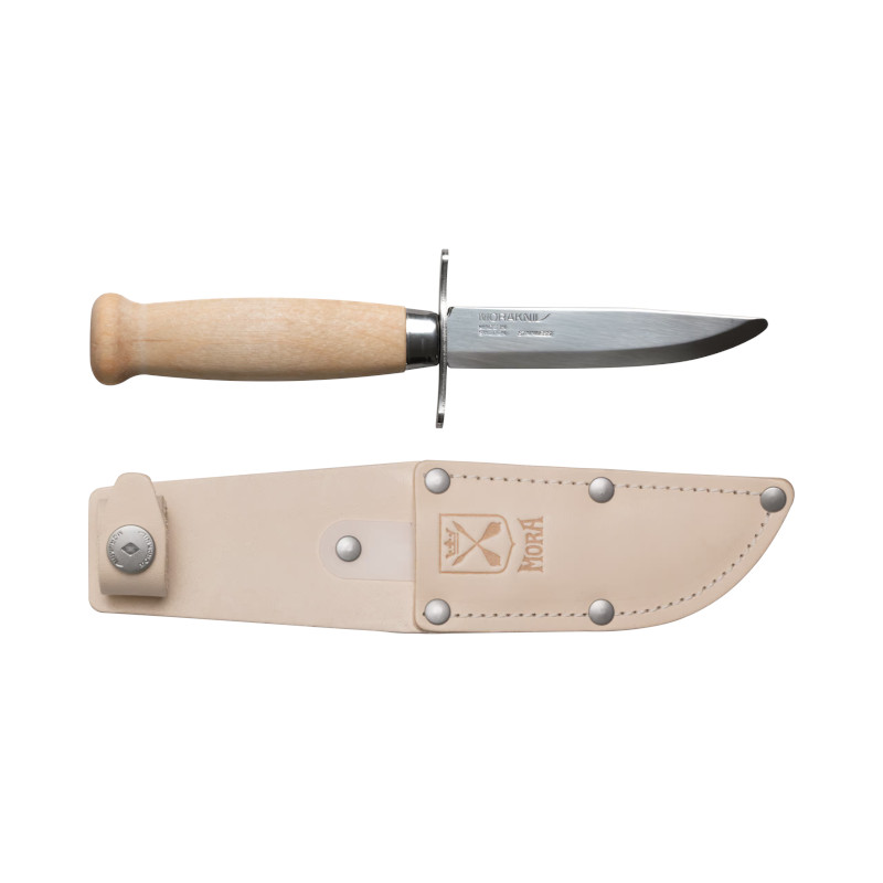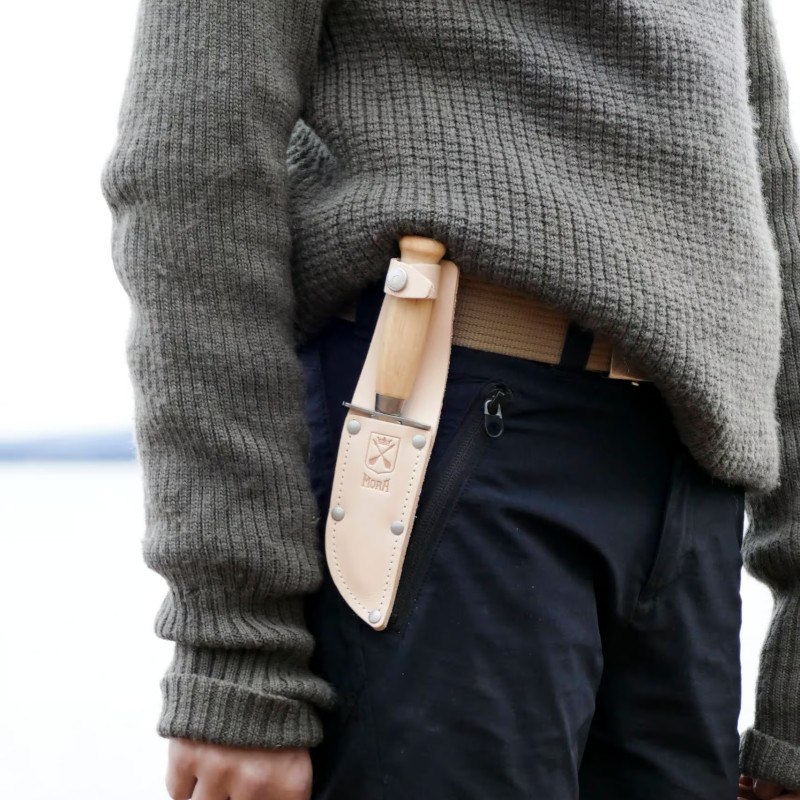 Morakniv scout 39 safe är en klassisk scoutkniv för barn. Denna friluftskniv för barn är designad för säkerhet och mångsidighet. Den har ett spetslöst blad av återvunnet svenskt rostfritt stål som håller skärpan länge, och ett skaft av FSC® certifierat skandinaviskt björkträ. Kniven har en dubbel parerstång och en mindre skaftgeometri som gör den bekväm att hålla för små händer. Knivslidan är gjord av vegetabiliskt garvat läder och har ett klassiskt knapplås för säker förvaring. Scoutknivarna har varit populära sedan 1930-talet och är idealiska för barn som vill utforska friluftsliv. Barn bör alltid hantera kniven under vuxens övervakning.