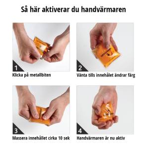 De är lätta att använda, för att aktivera handvärmarna “klickar” du på metallskivan. Innehållet kristalliserar sig så fort du klickat och ger då en temperatur på 54 grader och håller värmen i upp till 45 minuter. När du aktiverat dom, massera handvärmarna lite innan användning. För att återanvända handvärmarna behöver du värma upp dem i sjudande vatten. Då återgår dom till geléform igen. De ska ligga i vattnet tills alla kristaller är borta, annars återgår de till kristallform så fort du tar upp dem. Se till att dom är helt svala innan de används igen efter kokning.