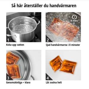 - För att använda igen: koka upp vatten i en kastrull, sjud handvärmarna tills kristallerna är borta (6 till 8 min), du ser att de är klara när det är helt genomskinliga igen, låt dom svalna helt innan du tar i dem